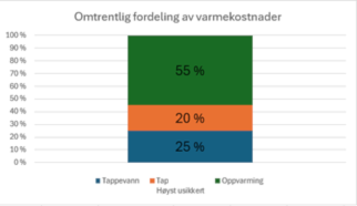 Fordelingen vil dog ikke være 100% forbruksbasert. Det er per i dag ikke mulig å måle varmtvannsforbruket til den enkelte leilighet, og dette vil være svært inngripende og dyrt å få gjennomført. Omtrentlig 20-25% av totalen er knyttet til oppvarming av tappevann. I tillegg har vi et ukjent tap mellom byggene våre.