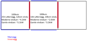 Bortsett fra lengde av yttervegg og antall kvadratmeter vinduer, er resterende parametere (areal, U-verdier, etasjehøyder m.m) identiske.